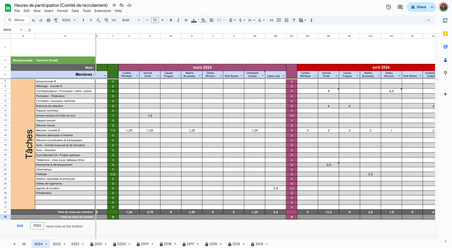 Compte tenu de sa facilité d'accès et d'utilisation, Google Sheets a été utilisé pour créer les feuilles de temps. La création remonte à plusieurs années. Une Google Sheets est aussi très flexible, ce qui facilite les changements. Mais cette flexibilité peut aussi causer des inconvénients. La disposition et structure des éléments dans une Google Sheets est fragile et est sujette à des bris accidentels. Il y a moyen de bloquer la modification de parties d'une Google Sheets, mais ça peut compliquer l'ajout ou modification de certains éléments, comme les noms de membre.