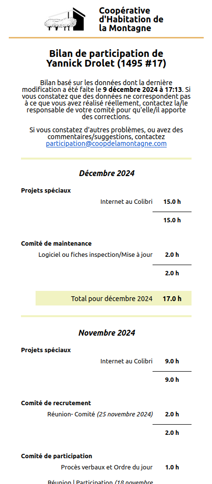L'extraction automatique s'exécute aux 30 minutes. Le programme parcourt et extrait les données de chaque ligne et colonne de chaque feuille, tout en vérifiant la disposition et structure. Le programme échoue s'il y a des problèmes dans la disposition et structure. Une correction manuelle devient donc nécessaire. L'extraction automatique peut prendre jusqu'à 5 minutes pour compléter. Les données extraites sont ensuite stockées dans une base de données avec une structure stricte. Cette fois-ci la lecture des données dans cette base de données est quasi instantanée. L'outil pour consulter son bilan de participation utilise les données qui sont dans cette base de données. Le bilan de participation envoyé par courriel ressemble à ceci :